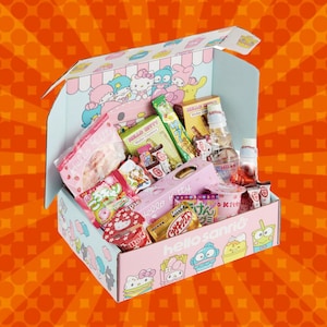 Unbox a surprise with the Hello Kitty Mystery Box. I mean the beautifully decorated box alone gets me super excited. Unbox this surprise and youll find a mix of Hello Kitty and other Sanrio-branded candy snacks and a drink all imported from Japan.
